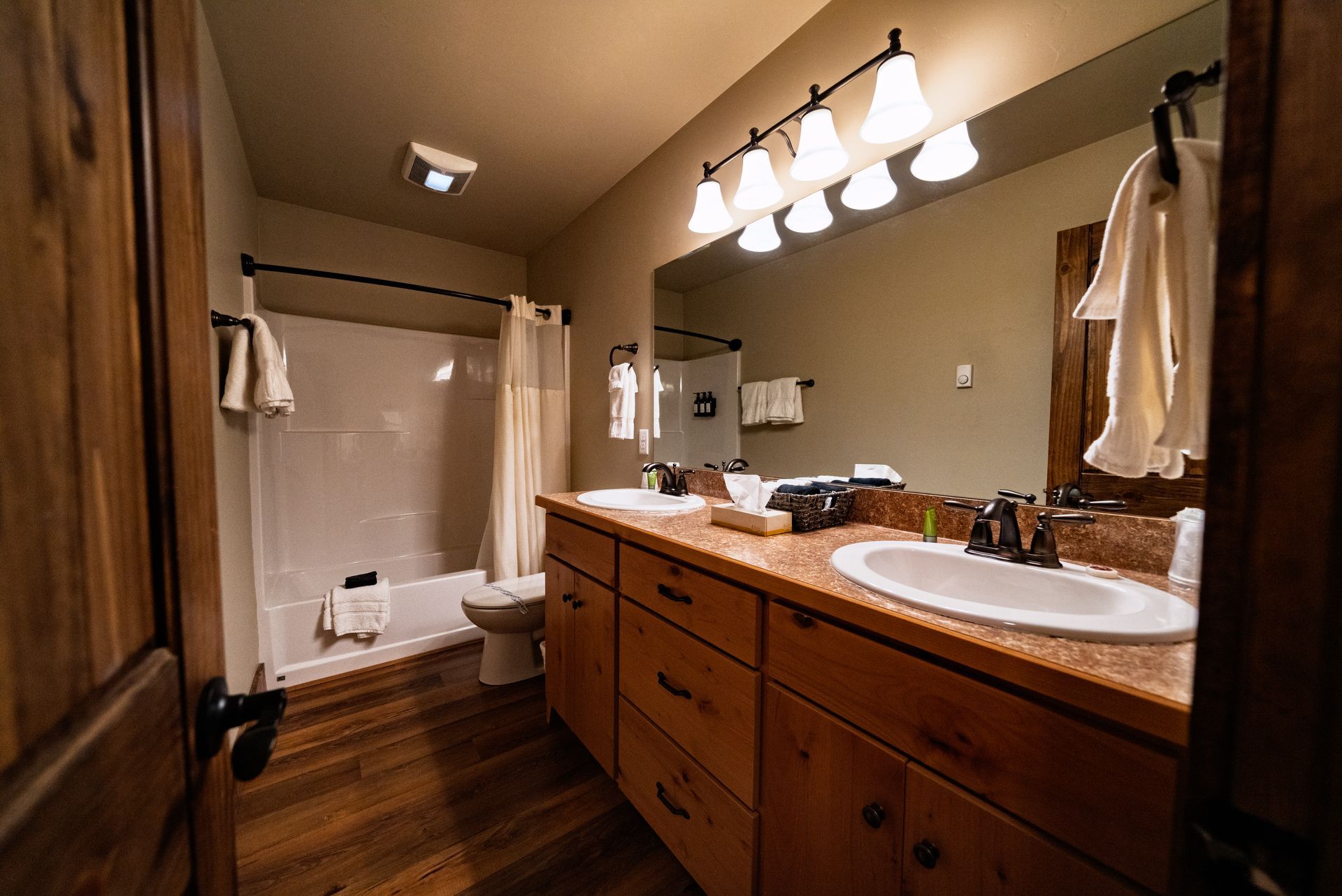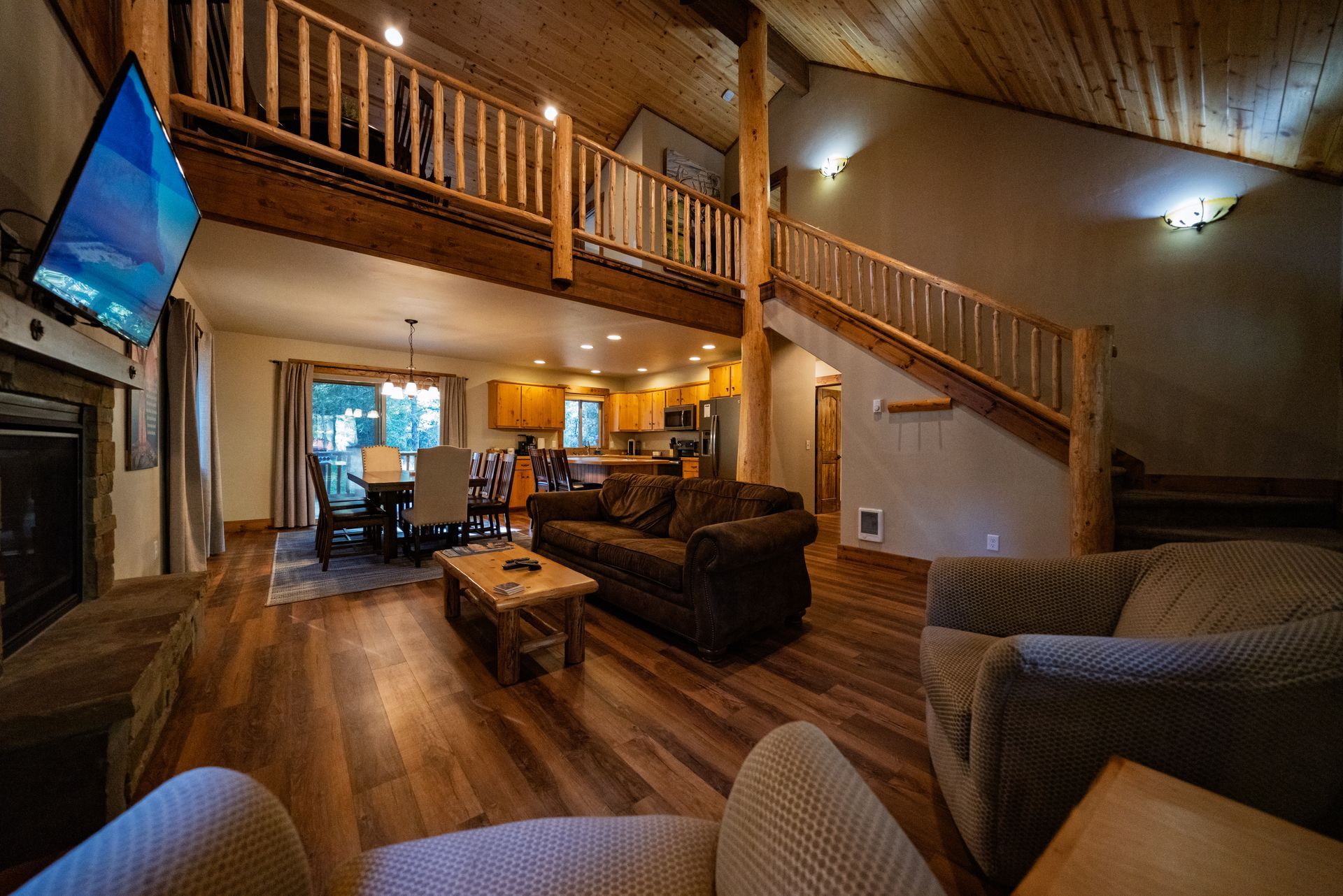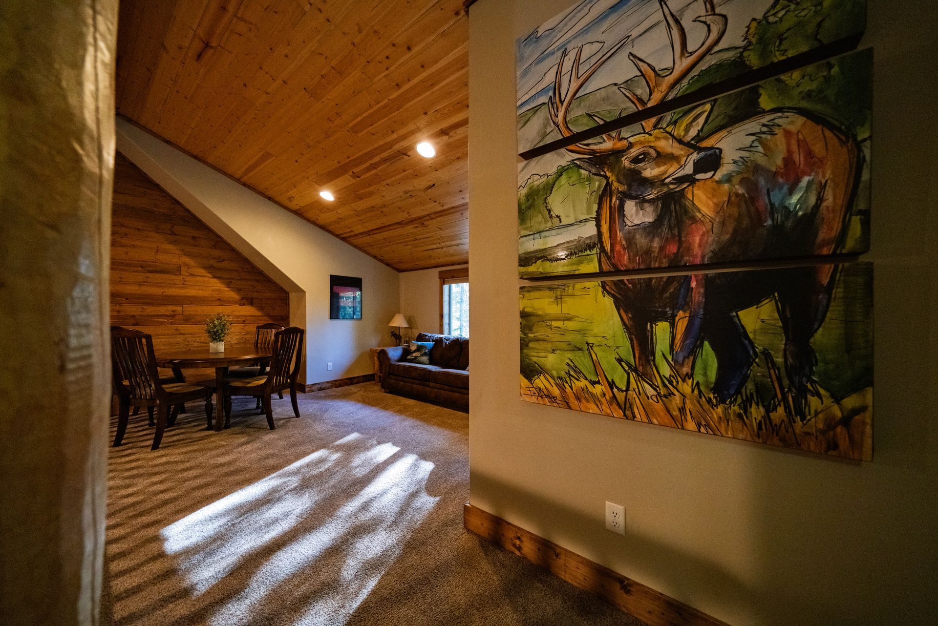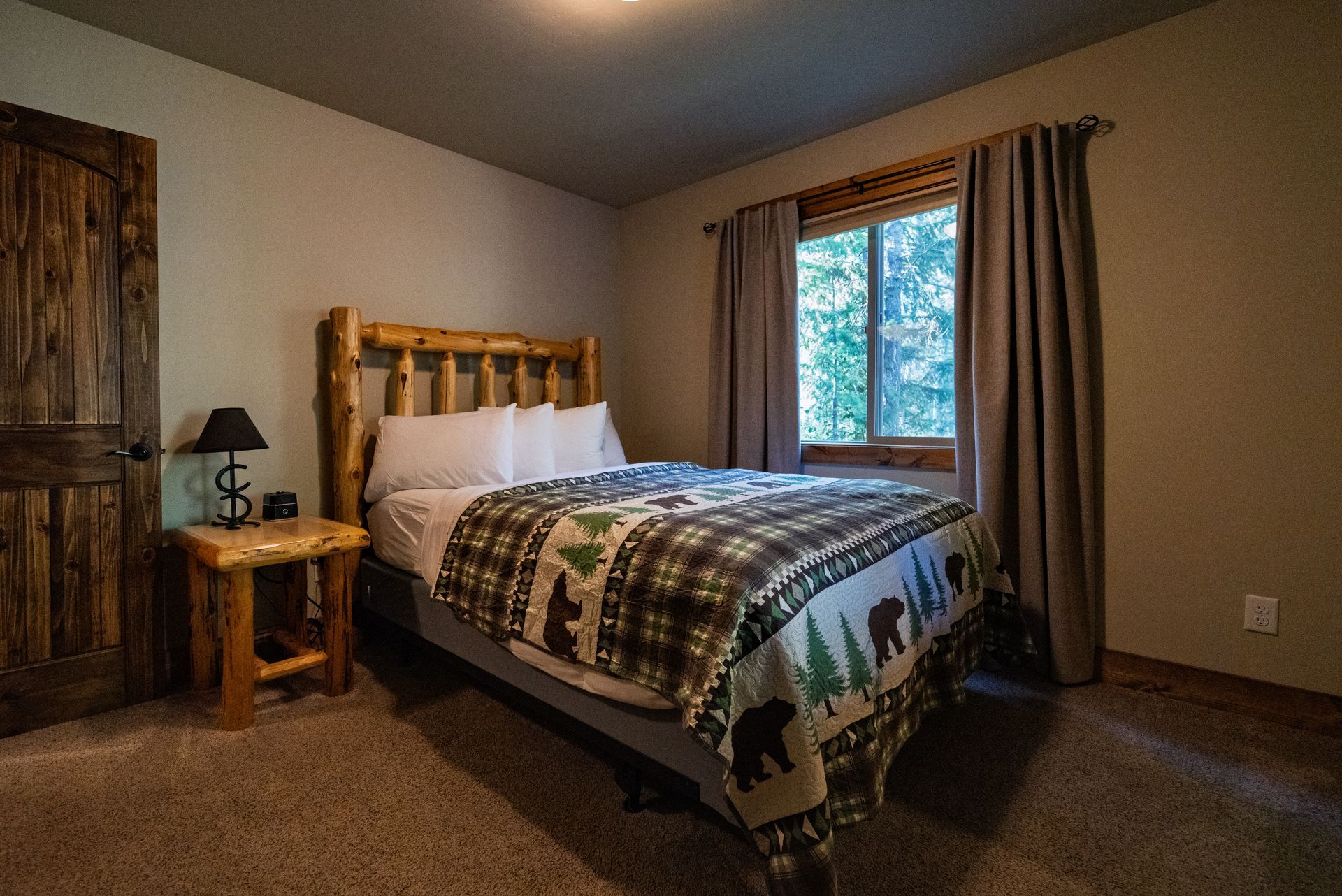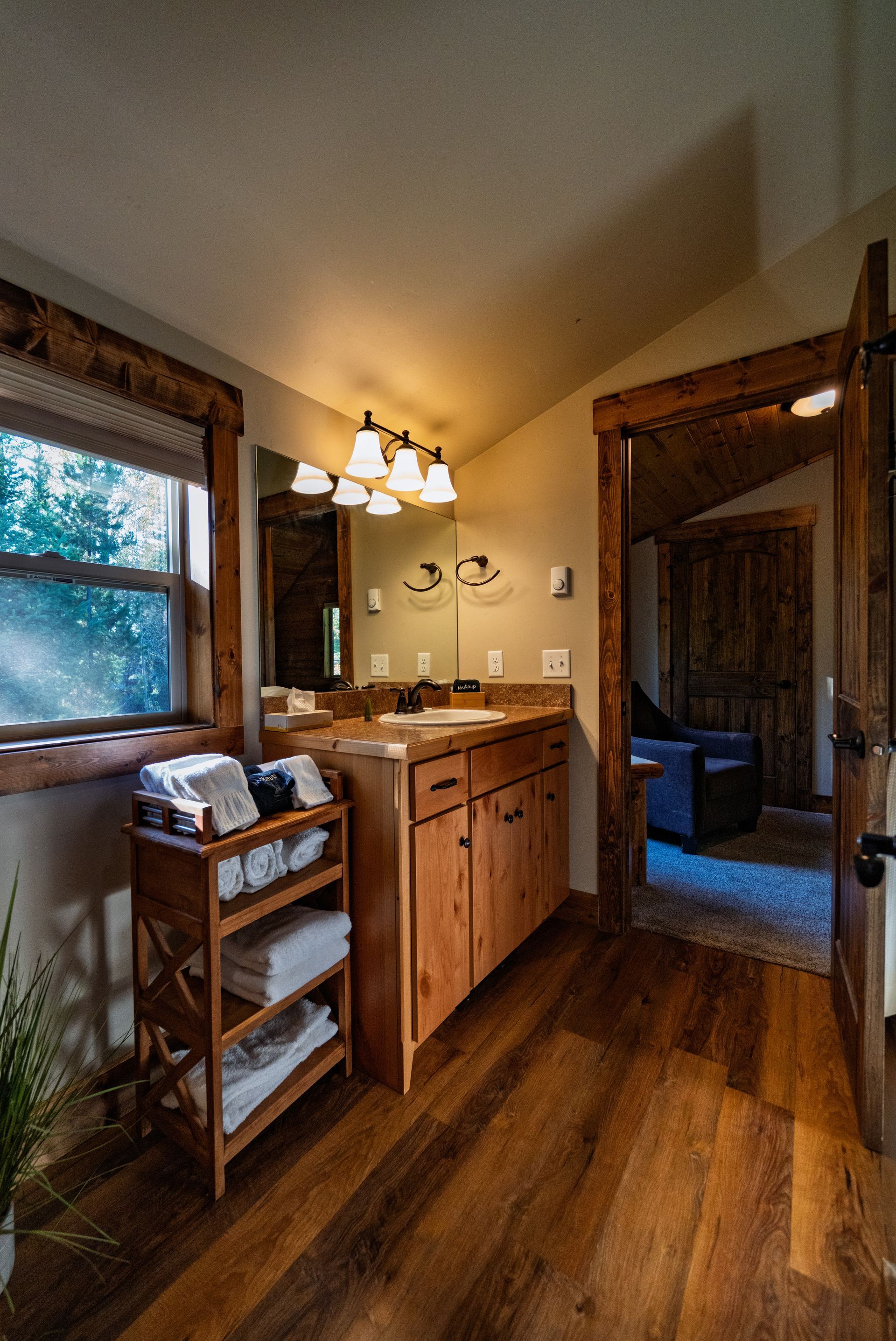 Escape to the Aspen King Suite at North Forty Resort, a cozy retreat in the heart of Whitefish, Montana. This spacious suite boasts a full kitchen (minus an oven), a comfy living room with a gas fireplace, and a queen bed accompanied by a sofa sleeper. The serene bedroom features a plush king bed, sleeper sofa and an additional bathroom, making it perfect for families or groups of up to 7. Enjoy cable TV and air conditioning in both rooms, and bring your furry friends along—this pet-friendly cabin invites you to create unforgettable memories in nature’s embrace!