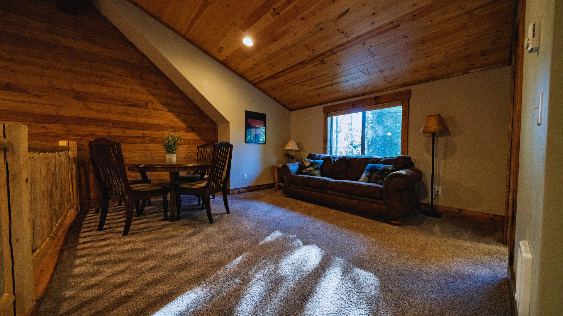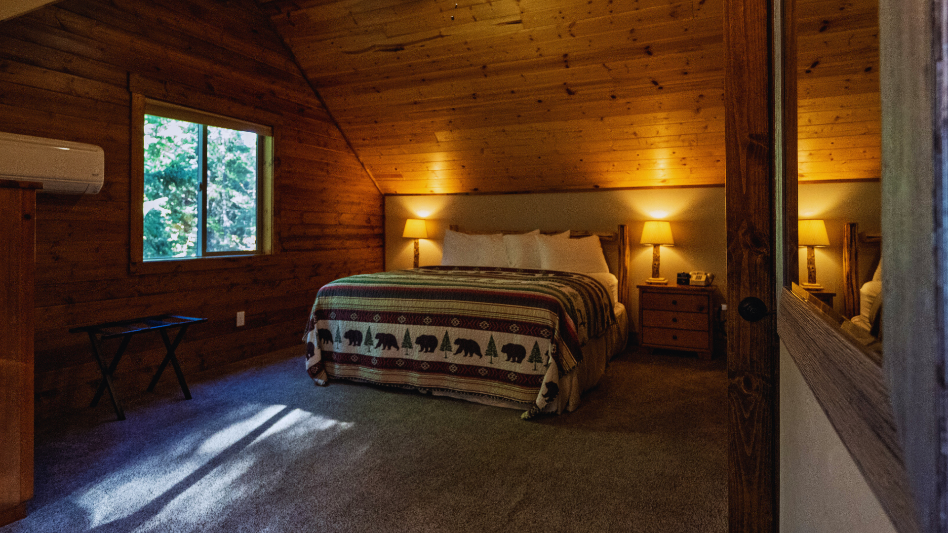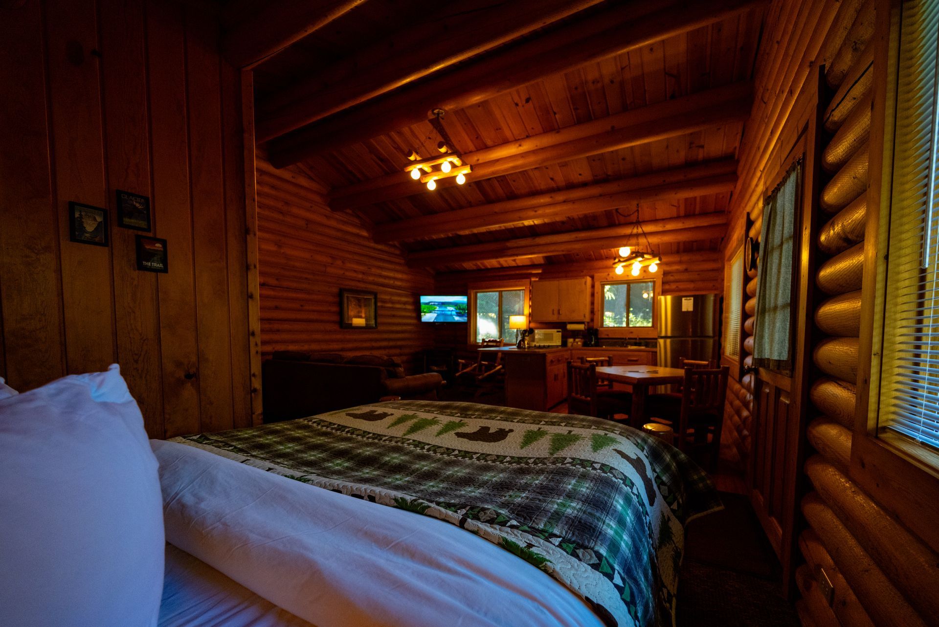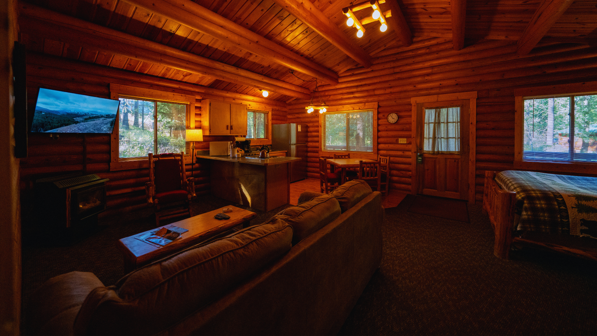 The Ponderosa cabins are individual one bedroom cabins with one queen bed, one twin bed and a sleeper sofa and can sleep up to 5 guests.